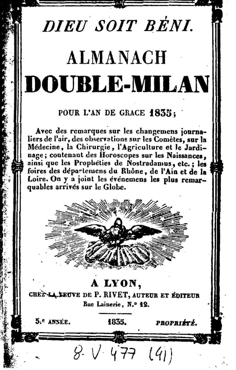 Il est probable que, le succès aidant, le Père Benoit a souhaité reprendre la paternité de l’almanach et la maîtrise du contenu (ce que l’on appellerait aujourd’hui la ligne éditoriale) d’autant plus que Pierre Rivet étant décédé, c’est sa veuve qui poursuivait l’édition du Double Milan, à sa manière, avec un contenu plutôt fantaisiste. On peut aisément imaginer que les relations se sont très vite tendues entre le vrai Père Benoit et la famille Rivet puisque deux Double Milan sont édités en 1835 : celui de la veuve Rivet qui indique en couverture que c’est la 5e année qu’elle en est l’auteur et l’éditeur et mentionne également qu’elle en a la propriété.